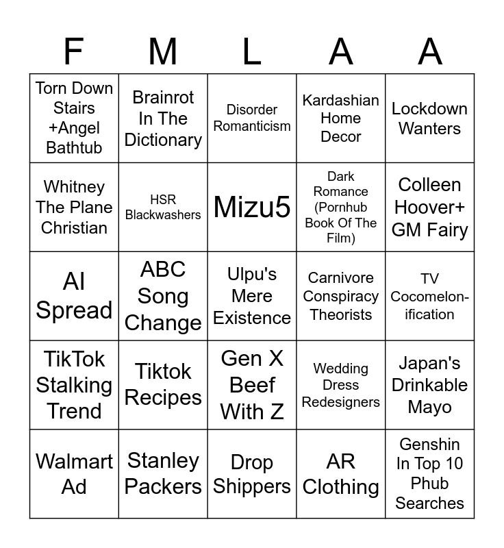 This bingo card has a free space and 24 words: Tiktok Recipes, Stanley Packers, Mizu5, Walmart Ad, Lockdown Wanters, Torn Down Stairs +Angel Bathtub, Whitney The Plane Christian, Brainrot In The Dictionary, Carnivore Conspiracy Theorists, Gen X Beef With Z, Dark Romance (Pornhub Book Of The Film), AI Spread, Wedding Dress Redesigners, Japan's Drinkable Mayo, HSR Blackwashers, AR Clothing, TV Cocomelon- ification, Disorder Romanticism, Colleen Hoover+ GM Fairy, ABC Song Change, Genshin In Top 10 Phub Searches, TikTok Stalking Trend, Kardashian Home Decor and Drop Shippers.