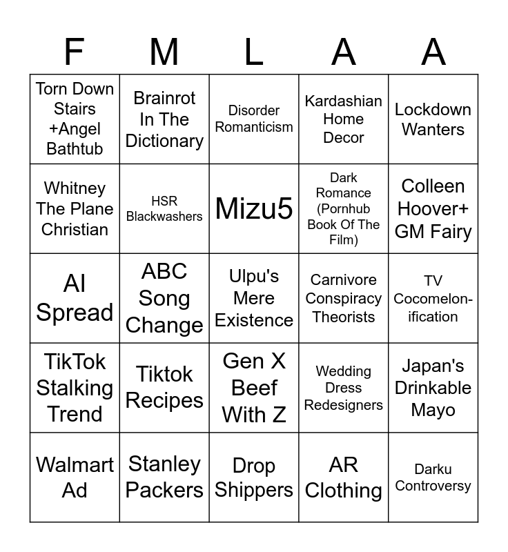This bingo card has a free space and 24 words: Tiktok Recipes, Stanley Packers, Mizu5, Walmart Ad, Lockdown Wanters, Torn Down Stairs +Angel Bathtub, Whitney The Plane Christian, Brainrot In The Dictionary, Carnivore Conspiracy Theorists, Gen X Beef With Z, Dark Romance (Pornhub Book Of The Film), AI Spread, Wedding Dress Redesigners, Japan's Drinkable Mayo, HSR Blackwashers, AR Clothing, TV Cocomelon- ification, Disorder Romanticism, Colleen Hoover+ GM Fairy, ABC Song Change, Darku Controversy, TikTok Stalking Trend, Kardashian Home Decor and Drop Shippers.