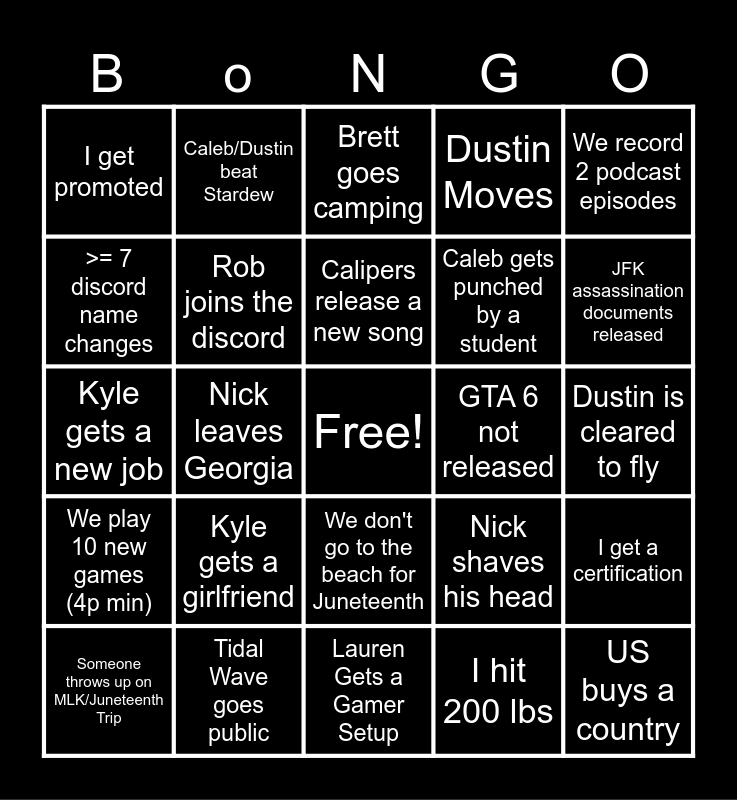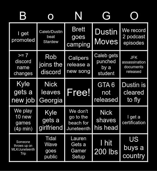 This bingo card has a free space and 24 words: Someone throws up on MLK/Juneteenth Trip, Kyle gets a girlfriend, Calipers release a new song, I hit 200 lbs, We record 2 podcast episodes, I get promoted, Caleb/Dustin beat Stardew, Brett goes camping, GTA 6 not released, Dustin is cleared to fly, Kyle gets a new job, Rob joins the discord, Nick shaves his head, I get a certification, >= 7 discord name changes, Tidal Wave goes public, Lauren Gets a Gamer Setup, Dustin Moves, JFK assassination documents released, We play 10 new games (4p min), Nick leaves Georgia, We don't go to the beach for Juneteenth, Caleb gets punched by a student and US buys a country.