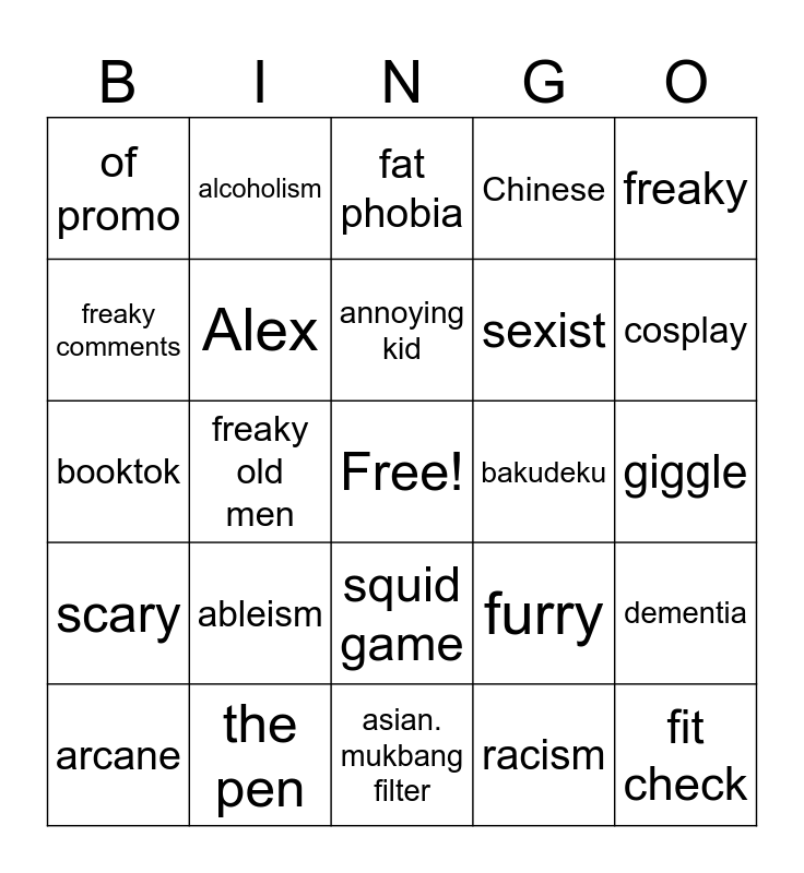 This bingo card has a free space and 24 words: ableism, the pen, annoying kid, arcane, freaky, of promo, freaky comments, alcoholism, bakudeku, squid game, sexist, booktok, furry, dementia, Alex, racism, giggle, fat phobia, cosplay, freaky old men, fit check, scary, Chinese and asian. mukbang filter.