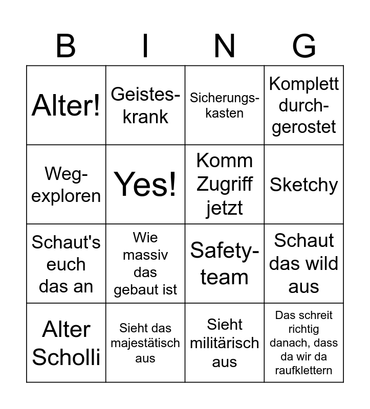 This bingo card has 16 words: Sieht das majestätisch aus, Schaut das wild aus, Sicherungs-kasten, Alter!, Schaut's euch das an, Geistes-krank, Safety-team, Sieht militärisch aus, Weg-exploren, Yes!, Alter Scholli, Komplett durch-gerostet, Wie massiv das gebaut ist, Sketchy, Komm Zugriff jetzt and Das schreit richtig danach, dass da wir da raufklettern.