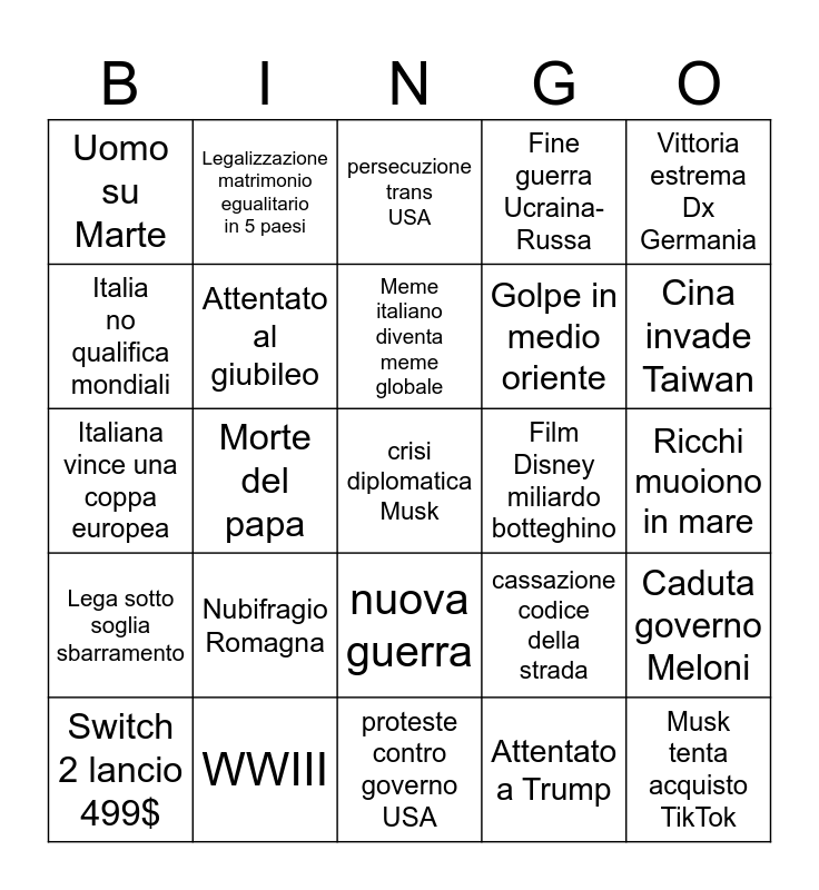 This bingo card has a free space and 24 words: Nubifragio Romagna, WWIII, Meme italiano diventa meme globale, Switch 2 lancio 499$, Vittoria estrema Dx Germania, Uomo su Marte, Italia no qualifica mondiali, Legalizzazione matrimonio egualitario in 5 paesi, Film Disney miliardo botteghino, nuova guerra, Golpe in medio oriente, Italiana vince una coppa europea, cassazione codice della strada, Caduta governo Meloni, Attentato al giubileo, Attentato a Trump, Ricchi muoiono in mare, persecuzione trans USA, Cina invade Taiwan, Morte del papa, Musk tenta acquisto TikTok, Lega sotto soglia sbarramento, Fine guerra Ucraina-Russa and proteste contro governo USA.