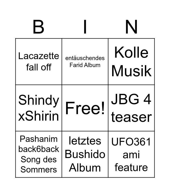 This bingo card has a free space and 8 words: JBG 4 teaser, Kolle Musik, entäuschendes Farid Album, Pashanim back6back Song des Sommers, Lacazette fall off, UFO361 ami feature, Shindy xShirin and letztes Bushido Album.