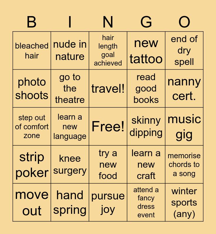 This bingo card has a free space and 24 words: knee surgery, hand spring, travel!, move out, end of dry spell, bleached hair, photo shoots, nude in nature, skinny dipping, try a new food, read good books, step out of comfort zone, learn a new craft, memorise chords to a song, go to the theatre, attend a fancy dress event, music gig, hair length goal achieved, nanny cert., learn a new language, winter sports (any), strip poker, new tattoo and pursue joy.