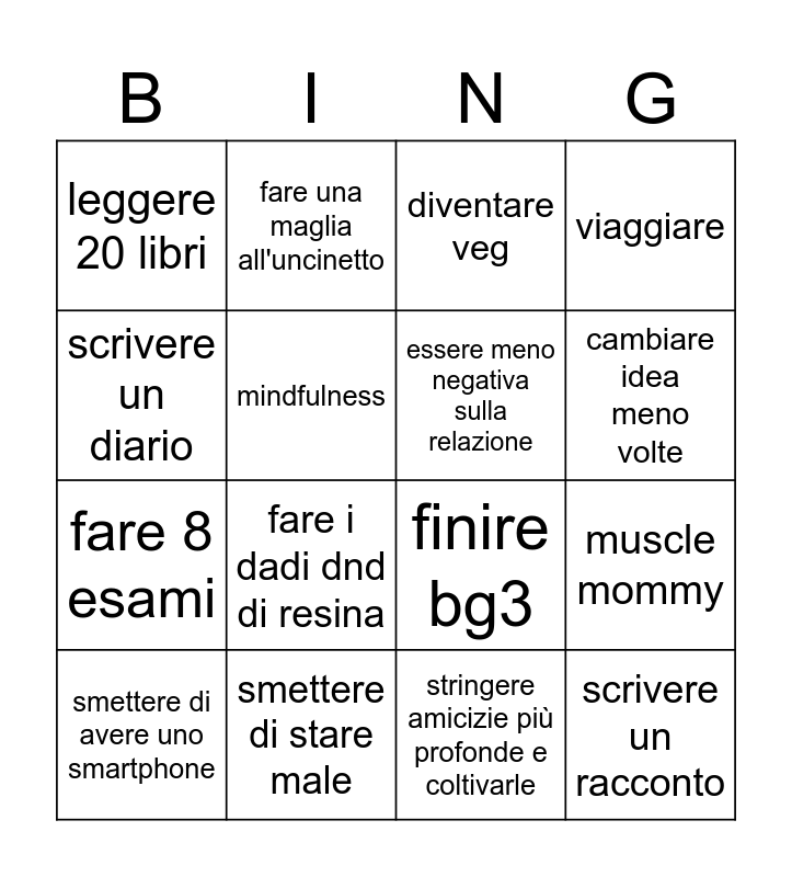 This bingo card has 16 words: smettere di stare male, muscle mommy, diventare veg, leggere 20 libri, fare 8 esami, fare una maglia all'uncinetto, finire bg3, stringere amicizie più profonde e coltivarle, scrivere un diario, mindfulness, smettere di avere uno smartphone, viaggiare, fare i dadi dnd di resina, cambiare idea meno volte, essere meno negativa sulla relazione and scrivere un racconto.
