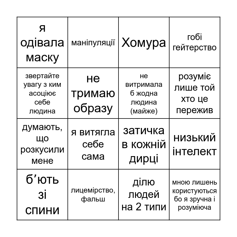 This bingo card has 16 words: лицемірство, фальш, низький інтелект, Хомура, я одівала маску, думають, що розкусили мене, маніпуляції, затичка в кожній дирці, ділю людей на 2 типи, звертайте увагу з ким асоціює себе людина, не тримаю образу, бʼють зі спини, гобі гейтерство, я витягла себе сама, розуміє лише той хто це пережив, не витримала б жодна людина (майже) and мною лишень користуються бо я зручна і розуміюча.