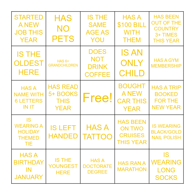 This bingo card has a free space and 24 words: IS LEFT HANDED, IS THE YOUNGEST HERE, DOES NOT DRINK COFFEE, HAS A BIRTHDAY IN JANUARY, HAS BEEN OUT OF THE COUNTRY 3+ TIMES THIS YEAR, STARTED A NEW JOB THIS YEAR, IS THE OLDEST HERE, HAS NO PETS, BOUGHT A NEW CAR THIS YEAR, HAS A TATTOO, IS AN ONLY CHILD, HAS A NAME WITH 6 LETTERS IN IT, HAS BEEN ON TWO CRUISES THIS YEAR, IS WEARING BLACK/GOLD NAIL POLISH, HAS 6+ GRANDCHILDREN, HAS RAN A MARATHON, HAS A TRIP BOOKED FOR THE NEW YEAR, IS THE SAME AGE AS YOU, HAS A GYM MEMBERSHIP, HAS READ 5+ BOOKS THIS YEAR, IS WEARING LONG SOCKS, IS WEARING A HOLIDAY THEMED TIE, HAS A $100 BILL WITH THEM and HAS A DOCTORATE DEGREE.