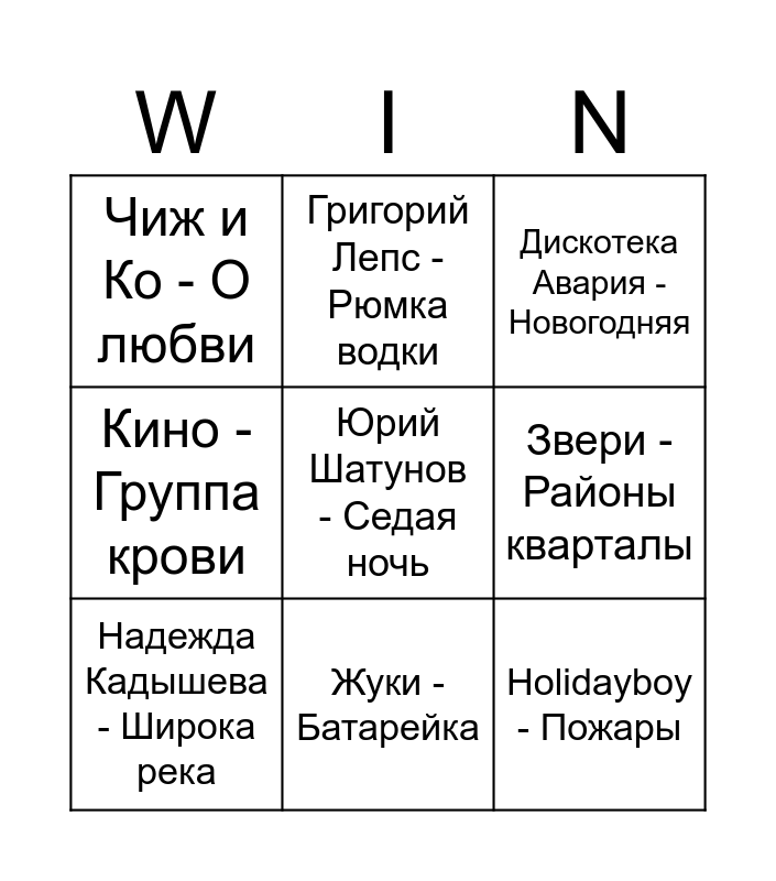 This bingo card has 30 words: Анна Асти - Царица, Андрей Губин - Зима-холода, Мумий Тролль - Владивосток 2000, Арсен Шахунц - Девочка стоп, Чиж и Ко - О любви, Дискотека Авария - Новогодняя, Надежда Кадышева - Широка река, Руки Вверх - Крошка моя, Женя Трофимов - Поезда, Король и Шут - Лесник, Jakone - Асфальт, Градусы - Вахтерам, Комбинация - Бухгалтер, Максим - Знаешь ли ты, Ленинград - Вояж, Рок острова - Ничего не говори, Иванушки - Три белых коня, Валерий Меладзе - Салют Вера, Надежда Кадышева - Веночек, Юрий Шатунов - Седая ночь, Ирина Аллегрова - Угонщица, Валерий Меладзе - Красиво, Григорий Лепс - Рюмка водки, Holidayboy - Пожары, Звери - Районы кварталы, Кино - Группа крови, Моргенштерн - Последняя любовь, Антон Токарев - Седьмой лепесток, Жуки - Батарейка and Порнофильмы - Я так соскучился.