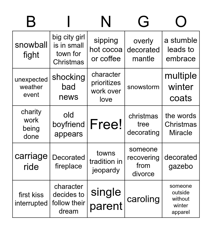 This bingo card has a free space and 24 words: Decorated fireplace, character decides to follow their dream, character prioritizes work over love, first kiss interrupted, a stumble leads to embrace, snowball fight, unexpected weather event, big city girl is in small town for Christmas, christmas tree decorating, towns tradition in jeopardy, snowstorm, charity work being done, someone recovering from divorce, decorated gazebo, shocking bad news, caroling, the words Christmas Miracle, sipping hot cocoa or coffee, multiple winter coats, old boyfriend appears, someone outside without winter apparel, carriage ride, overly decorated mantle and single parent.