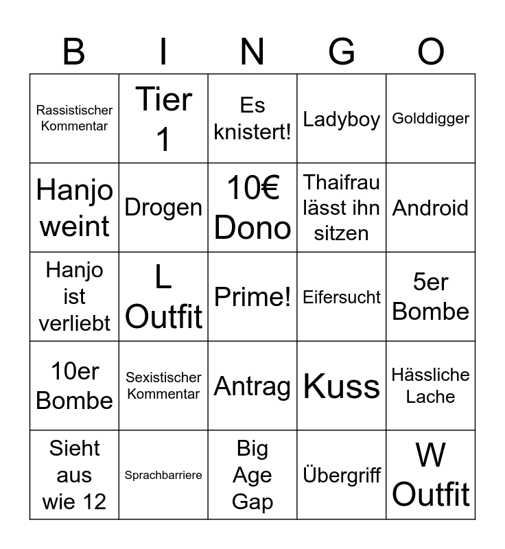 This bingo card has a free space and 24 words: Sexistischer Kommentar, Sprachbarriere, 10€ Dono, Sieht aus wie 12, Golddigger, Rassistischer Kommentar, Hanjo weint, Tier 1, Eifersucht, Antrag, Thaifrau lässt ihn sitzen, Hanjo ist verliebt, Kuss, Hässliche Lache, Drogen, Übergriff, 5er Bombe, Es knistert!, Android, L Outfit, W Outfit, 10er Bombe, Ladyboy and Big Age Gap.