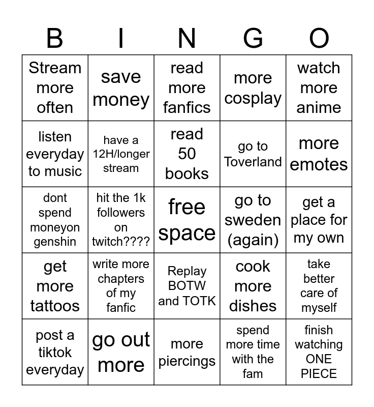 This bingo card has a free space and 24 words: write more chapters of my fanfic, go out more, read 50 books, post a tiktok everyday, watch more anime, Stream more often, listen everyday to music, save money, go to sweden (again), Replay BOTW and TOTK, go to Toverland, dont spend moneyon genshin, cook more dishes, take better care of myself, have a 12H/longer stream, spend more time with the fam, get a place for my own, read more fanfics, more emotes, hit the 1k followers on twitch????, finish watching ONE PIECE, get more tattoos, more cosplay and more piercings.