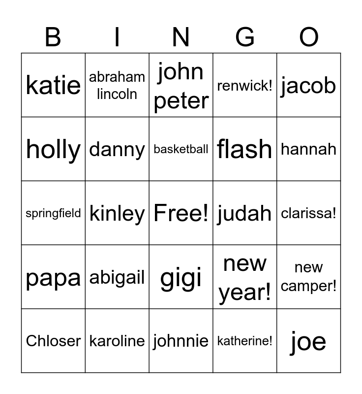 This bingo card has a free space and 29 words: Chloser, jackson, kinley, clara, katie, john peter, danny, abigail, judah, karoline, clarissa!, joe, johnnie, katherine!, hannah, jace, gigi, papa, jacob, springfield, new year!, 2025, flash, holly, renwick!, abraham lincoln, new camper!, basketball and captain james.