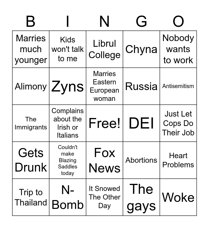 This bingo card has a free space and 24 words: Couldn't make Blazing Saddles today, N-Bomb, Marries Eastern European woman, Trip to Thailand, Nobody wants to work, Marries much younger, Alimony, Kids won't talk to me, DEI, Fox News, Russia, The Immigrants, Abortions, Heart Problems, Zyns, The gays, Just Let Cops Do Their Job, Librul College, Antisemitism, Complains about the Irish or Italians, Woke, Gets Drunk, Chyna and It Snowed The Other Day.