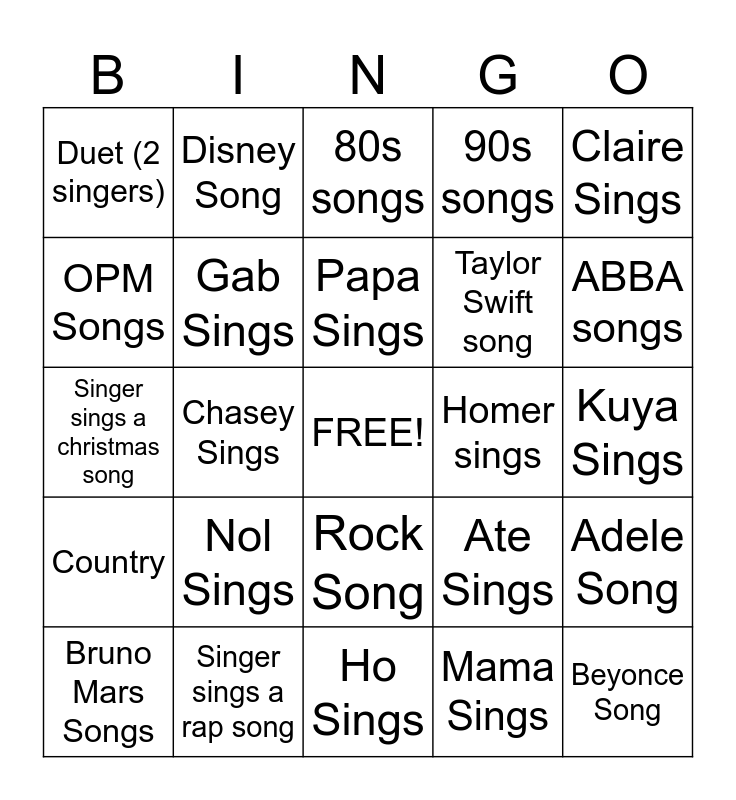 This bingo card has a free space and 24 words: Nol Sings, Singer sings a rap song, Papa Sings, Bruno Mars Songs, Claire Sings, Duet (2 singers), OPM Songs, Disney Song, Homer sings, Rock Song, Taylor Swift song, Singer sings a christmas song, Ate Sings, Adele Song, Gab Sings, Mama Sings, Kuya Sings, 80s songs, ABBA songs, Chasey Sings, Beyonce Song, Country, 90s songs and Ho Sings.
