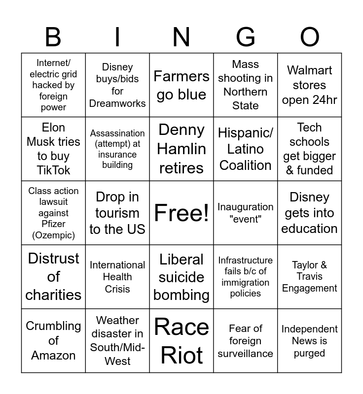 This bingo card has a free space and 24 words: International Health Crisis, Weather disaster in South/Mid-West, Denny Hamlin retires, Crumbling of Amazon, Walmart stores open 24hr, Internet/ electric grid hacked by foreign power, Elon Musk tries to buy TikTok, Disney buys/bids for Dreamworks, Inauguration "event", Liberal suicide bombing, Hispanic/ Latino Coalition, Class action lawsuit against Pfizer (Ozempic), Infrastructure fails b/c of immigration policies, Taylor & Travis Engagement, Assassination (attempt) at insurance building, Fear of foreign surveillance, Disney gets into education, Farmers go blue, Tech schools get bigger & funded, Drop in tourism to the US, Independent News is purged, Distrust of charities, Mass shooting in Northern State and Race Riot.