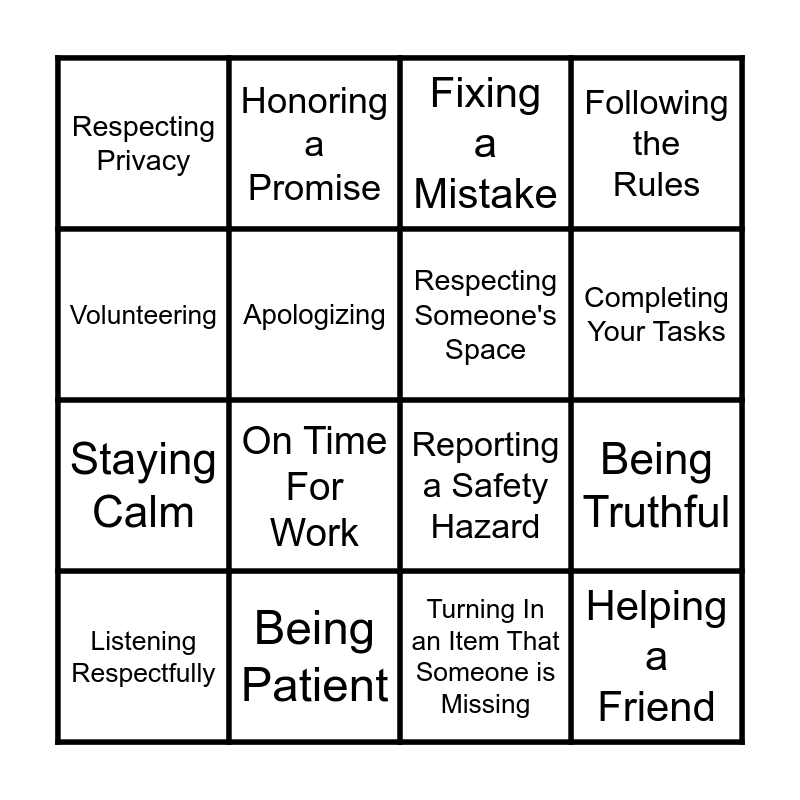 This bingo card has 18 words: On Time For Work, Helping a Friend, Fixing a Mistake, Respecting Privacy, Reporting a Safety Hazard, Following the Rules, Listening Respectfully, Honoring a Promise, Completing Your Tasks, Staying Calm, Turning In an Item That Someone is Missing, Volunteering, Being Truthful, Apologizing, Respecting Someone's Space, Cleaning Up After Yourself, Being Patient and Being Kind.