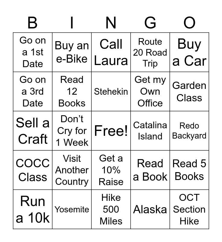 This bingo card has a free space and 24 words: Visit Another Country, Yosemite, Stehekin, Run a 10k, Buy a Car, Go on a 1st Date, Go on a 3rd Date, Buy an e-Bike, Catalina Island, Get a 10% Raise, Get my Own Office, Sell a Craft, Read a Book, Read 5 Books, Read 12 Books, Alaska, Redo Backyard, Call Laura, Garden Class, Don’t Cry for 1 Week, OCT Section Hike, COCC Class, Route 20 Road Trip and Hike 500 Miles.