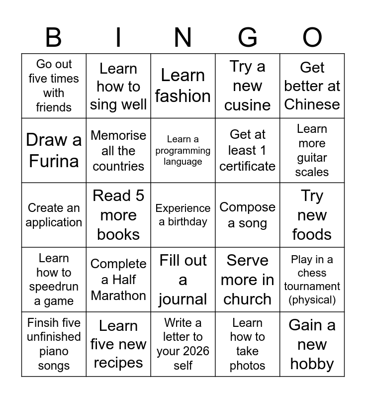 This bingo card has a free space and 24 words: Complete a Half Marathon, Learn five new recipes, Learn a programming language, Finsih five unfinished piano songs, Get better at Chinese, Go out five times with friends, Draw a Furina, Learn how to sing well, Compose a song, Fill out a journal, Get at least 1 certificate, Create an application, Serve more in church, Play in a chess tournament (physical), Memorise all the countries, Learn how to take photos, Try new foods, Learn fashion, Learn more guitar scales, Read 5 more books, Gain a new hobby, Learn how to speedrun a game, Try a new cusine and Write a letter to your 2026 self.