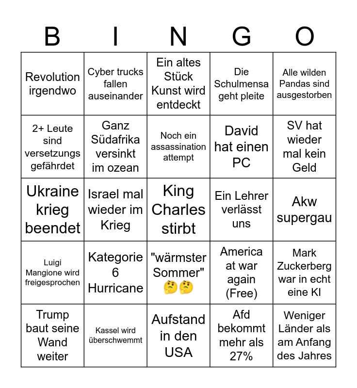 This bingo card has 25 words: Kategorie 6 Hurricane, Aufstand in den USA, Noch ein assassination attempt, Trump baut seine Wand weiter, Alle wilden Pandas sind ausgestorben, Revolution irgendwo, 2+ Leute sind versetzungs gefährdet, Cyber trucks fallen auseinander, Ein Lehrer verlässt uns, "wärmster Sommer" 🤔🤔, David hat einen PC, Ukraine krieg beendet, America at war again (Free), Mark Zuckerberg war in echt eine KI, Ganz Südafrika versinkt im ozean, Weniger Länder als am Anfang des Jahres, Akw supergau, Ein altes Stück Kunst wird entdeckt, SV hat wieder mal kein Geld, Israel mal wieder im Krieg, King Charles stirbt, Kassel wird überschwemmt, Luigi Mangione wird freigesprochen, Die Schulmensa geht pleite and Afd bekommt mehr als 27%.