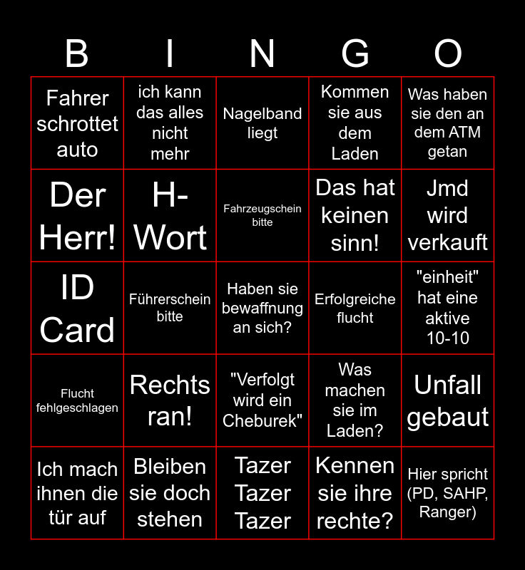 This bingo card has 25 words: Rechts ran!, Tazer Tazer Tazer, Fahrzeugschein bitte, Ich mach ihnen die tür auf, Was haben sie den an dem ATM getan, Fahrer schrottet auto, Der Herr!, ich kann das alles nicht mehr, Erfolgreiche flucht, "Verfolgt wird ein Cheburek", Das hat keinen sinn!, ID Card, Was machen sie im Laden?, Unfall gebaut, H-Wort, Hier spricht (PD, SAHP, Ranger), "einheit" hat eine aktive 10-10, Nagelband liegt, Jmd wird verkauft, Führerschein bitte, Haben sie bewaffnung an sich?, Bleiben sie doch stehen, Flucht fehlgeschlagen, Kommen sie aus dem Laden and Kennen sie ihre rechte?.