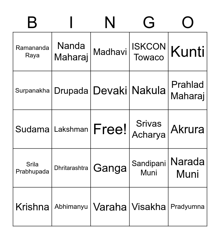 This bingo card has a free space and 94 words: Matsya, Kurma, Varaha, Narasimha, Vamana, Rama, Balaram, Krishna, Parshuram, Kalki, Arjun, Bhima, Yudhishtir, Nakula, Sahadev, Kunti, Madhavi, Pandu, Shantanu, Duryodhan, Bhisma, Drona, Kripacharya, Dushasan, Dhritarashtra, Drupada, Draupadi, Dhristadyumna, Virata, Sanjay, Abhimanyu, Ganga, Shiva, Brahma, Nanda Maharaj, Kamsa, Mother Yasoda, Vasudev, Devaki, Sandipani Muni, Sudama, Srila Prabhupada, Akrura, Rukmini, Pradyumna, Aniruddha, Subhadra, Putana, Aghasura, Radha, Lalita, Visakha, Gandhari, Shalya, Shakuni, Keikeyi, Kaushalya, Sumitra, Hanuman, Sita, Lakshman, Sugriva, Bharat, Shatrugna, Ravana, Indrajit, Kumbhakarna, Vibhishan, Surpanakha, Vali, Angad, Jambavan, Nilamani Das, Shyamkund Das, ISKCON Towaco, ISKCON Parsippany, 100 Jacksonville Rd, Prahlad Maharaj, Narada Muni, Chaitanya Mahaprabhu, Nityananda, Advaita Acharya, Gadadhar Pandit, Srivas Acharya, Ramananda Raya, Sachi Mata, Jagannath Mishra, Haridas Thakur, Sanatan Goswami, Rupa Goswami, Jiva Goswami, Ragunath Bhatta Goswami, Ragunath Das Goswami and Gopal Bhatta Goswami.