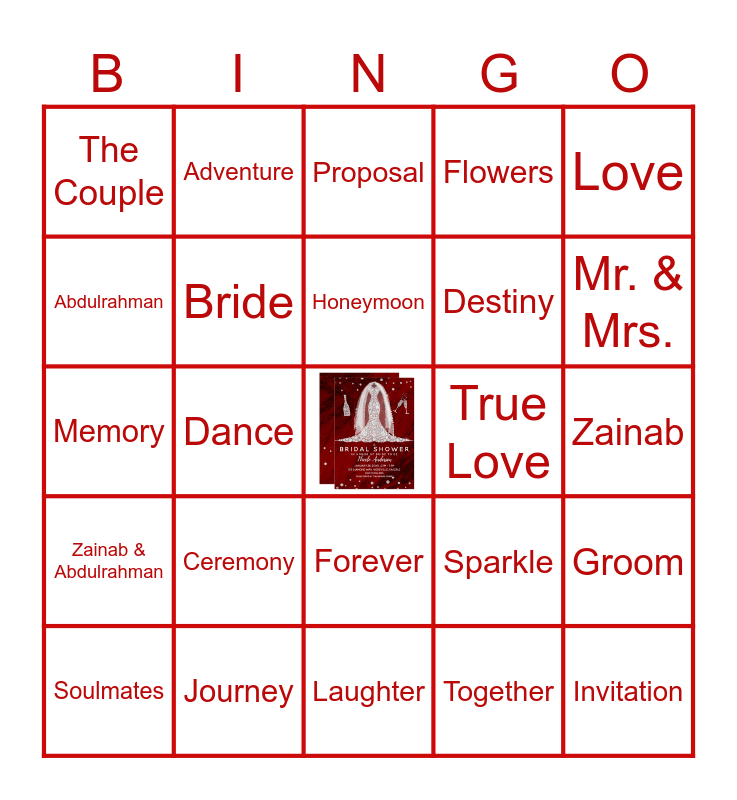 This bingo card has a free space and 37 words: Wedding Dress, Bouquet, Rings, Bride, Groom, Ceremony, Honeymoon, Reception, Love, Cake, Dance, Flowers, Invitation, Zainab, Abdulrahman, Zainab & Abdulrahman, First Date, Proposal, Forever, True Love, The Couple, Mr. & Mrs., Soulmates, Laughter, Promise, Together, Adventure, Partnership, Happily Ever After, Celebration, Romance, Journey, Memory, Happiness, Sparkle, Destiny and Blessings.