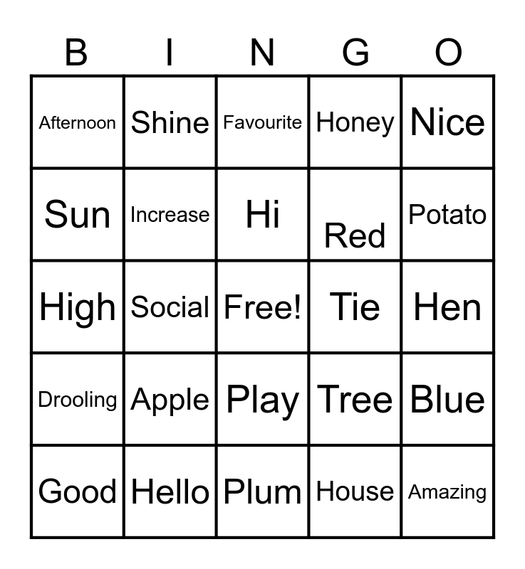 This bingo card has a free space and 24 words: Apple, Hello, Hi, Good, Nice, Afternoon, Sun, Shine, Tie, Play, Red, High, Tree, Blue, Increase, House, Hen, Favourite, Potato, Social, Amazing, Drooling, Honey and Plum.