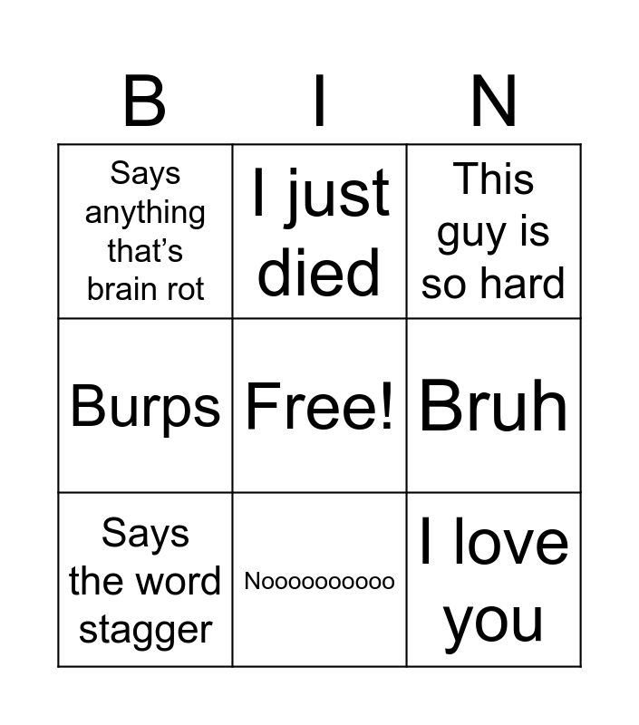 This bingo card has a free space and 8 words: Bruh, This guy is so hard, I just died, Says the word stagger, Says anything that’s brain rot, I love you, Burps and Noooooooooo.
