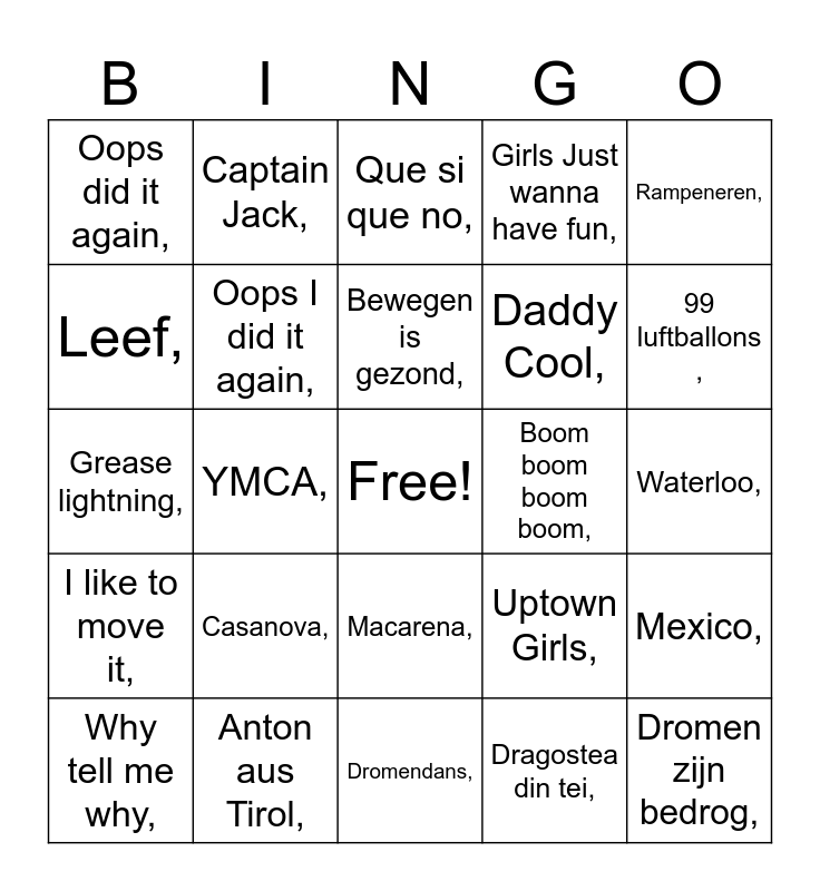 This bingo card has a free space and 46 words: Ich bin wie du,, Dromen zijn bedrog,, Ademnood,, Dromendans,, Casanova,, Rainbow in the sky,, Captain Jack,, Viben,, Leef,, Total eclips of the heart,, Oops I did it again,, Girls Just wanna have fun,, Mexico,, Uptown Girls,, Funky town,, Paloma blanca,, Bewegen is gezond,, Boom boom boom boom,, Links rechts,, Rampeneren,, YMCA,, Dragostea din tei,, Oops did it again,, Daddy Cool,, Love me Just a little bit more,, 99 luftballons ,, Why tell me why,, Paradise by the dashboard light,, Macarena,, I like to move it,, Liever te dik in de kist,, Follow the leader,, Schudden,, Atje voor de sfeer,, Take on me,, Anton aus Tirol,, Waterloo,, Eye of the tiger,, Narcotic,, La bomba,, Vamos a la playa,, Que si que no,, Grease lightning,, Wake me up before you go go,, Heb je even voor mij, and Ding dong song,.