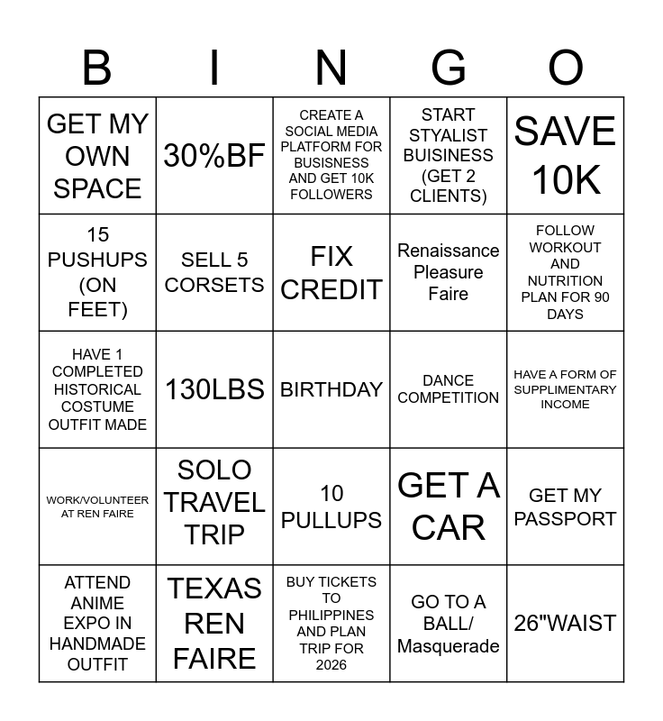 This bingo card has a free space and 24 words: SOLO TRAVEL TRIP, TEXAS REN FAIRE, FIX CREDIT, ATTEND ANIME EXPO IN HANDMADE OUTFIT, SAVE 10K, GET MY OWN SPACE, 15 PUSHUPS (ON FEET), 30%BF, DANCE COMPETITION, 10 PULLUPS, Renaissance Pleasure Faire, HAVE 1 COMPLETED HISTORICAL COSTUME OUTFIT MADE, GET A CAR, GET MY PASSPORT, SELL 5 CORSETS, GO TO A BALL/ Masquerade, HAVE A FORM OF SUPPLIMENTARY INCOME, CREATE A SOCIAL MEDIA PLATFORM FOR BUSISNESS AND GET 10K FOLLOWERS, FOLLOW WORKOUT AND NUTRITION PLAN FOR 90 DAYS, 130LBS, 26"WAIST, WORK/VOLUNTEER AT REN FAIRE, START STYALIST BUISINESS (GET 2 CLIENTS) and BUY TICKETS TO PHILIPPINES AND PLAN TRIP FOR 2026.