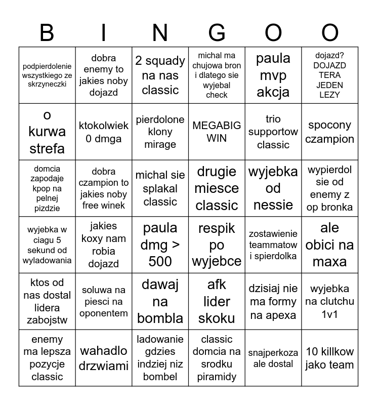 This bingo card has 36 words: afk lider skoku, dawaj na bombla, classic domcia na srodku piramidy, o kurwa strefa, wyjebka w ciagu 5 sekund od wyladowania, drugie miesce classic, ktokolwiek 0 dmga, ladowanie gdzies indziej niz bombel, paula mvp akcja, dzisiaj nie ma formy na apexa, spocony czampion, michal ma chujowa bron i dlatego sie wyjebal check, wyjebka na clutchu 1v1, dobra czampion to jakies noby free winek, MEGABIG WIN, podpierdolenie wszystkiego ze skrzyneczki, ktos od nas dostal lidera zabojstw, wyjebka od nessie, domcia zapodaje kpop na pelnej pizdzie, 2 squady na nas classic, michal sie splakal classic, jakies koxy nam robia dojazd, respik po wyjebce, paula dmg > 500, zostawienie teammatow i spierdolka, dobra enemy to jakies noby dojazd, trio supportow classic, wahadlo drzwiami, pierdolone klony mirage, dojazd? DOJAZD TERA JEDEN LEZY, 10 killkow jako team, enemy ma lepsza pozycje classic, ale obici na maxa, wypierdol sie od enemy z op bronka, soluwa na piesci na oponentem and snajperkoza ale dostal.