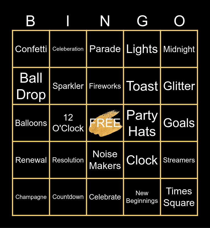 This bingo card has a free space and 24 words: Resolution, Countdown, Fireworks, Champagne, Midnight, Confetti, Ball Drop, Celeberation, Party Hats, Noise Makers, Toast, Balloons, Clock, Streamers, Sparkler, New Beginnings, Goals, Parade, Glitter, 12 O'Clock, Times Square, Renewal, Lights and Celebrate.