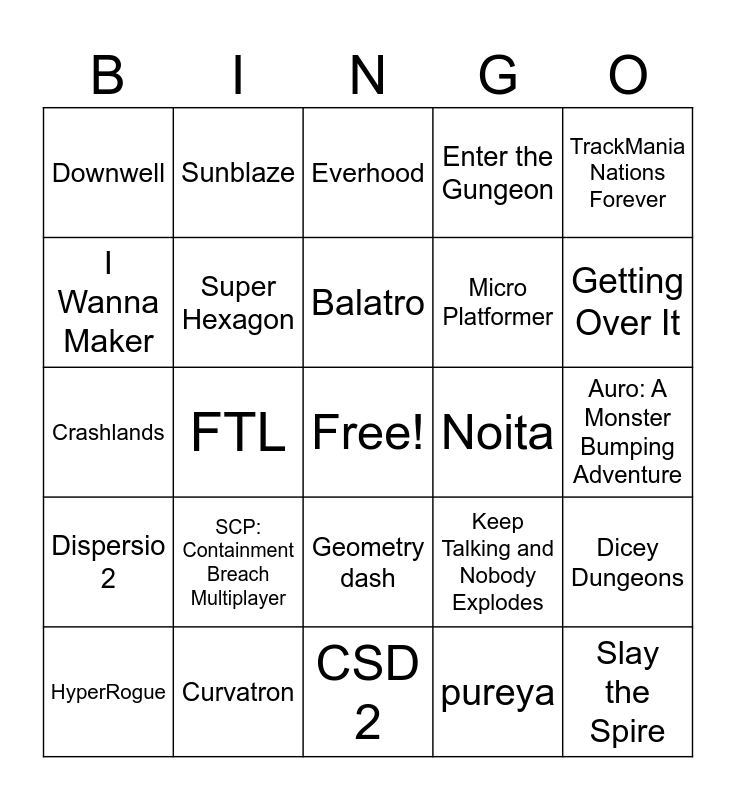 This bingo card has a free space and 91 words: A Dance of Fire and Ice, A Hat in Time, Geometry dash, Celeste, Crypt of the Necrodancer, Old School Musical, You Have 10 Seconds (2022), Hollow Knight, JSAB, Neon White, 10 Seconds Ninja X, 64.0, Atomicrops, Auro: A Monster Bumping Adventure, BADLAND: GOTY Edition, Balatro, Baldi's Basics, Bananner Nababber, Bejeweled 3, Blasphemous, Castle Crashers, Cognizer, CSD 2, CSD 3, Crashlands, Curvatron, Dead Cells, DRG, Deepest Sword, Desktop Dungeons, Despotism 3k, Dicey Dungeons, Dispersio, Dispersio 2, Downwell, Enter the Gungeon, Everhood, Fork Parker's Holiday Profit Hike, FTL, Getting Over It, HyperRogue, I Wanna Maker, Intravenous, Jump King, Katana Zero, Keep Talking and Nobody Explodes, Khimera: Destroy All Monster Girls, Kirby's Dream Course, Kreedz Climbing, Levelhead, Metroid: Zero Mission, Micro Platformer, Muck, Muse Dash, N++, Neon Beats, Noita, OLDTV, One Finger Death Punch, Overclocked, Overcooked 2, Peggle Deluxe, Peggle Extreme, Peggle Nights, Pogostuck, Pokemon Mystery Dungeon, Portal, pureya, Risk of Rain 2, Rogue Legacy, SCP: Containment Breach Multiplayer, Slay the Spire, Stardew Valley, STAY, Sunblaze, Super Hexagon, Super Meat Boy, Superliminal, The End is Nigh, The Messenger, Timberman, TrackMania Nations Forever, UCN, vivid/stasis, Voidigo, VVVVVV, Will You Snail?, Wizard of Legend, You Have to Win the Game, Zardy's Maze and Zuma's Revenge.