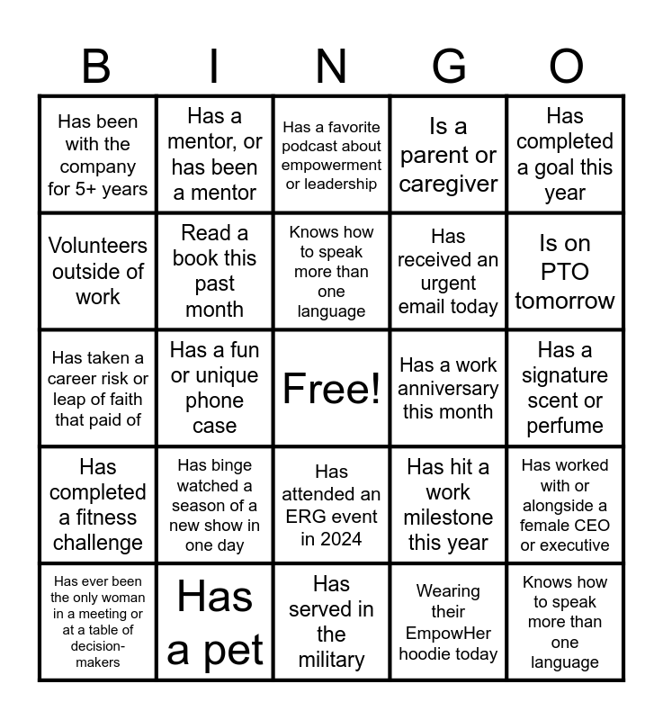 This bingo card has a free space and 26 words: Has attended an ERG event in 2024, Wearing their EmpowHer hoodie today, Knows how to speak more than one language, Has a pet, Has completed a goal this year, Has been with the company for 5+ years, Volunteers outside of work, Has a mentor, or has been a mentor, Has a signature scent or perfume, Has hit a work milestone this year, Has received an urgent email today, Has taken a career risk or leap of faith that paid of, Has worked with or alongside a female CEO or executive, Has ever been the only woman in a meeting or at a table of decision-makers, Has a fun or unique phone case, Has attended a women’s leadership conference or seminar, Is a parent or caregiver, Has completed a fitness challenge, Has a favorite podcast about empowerment or leadership, Knows how to speak more than one language, Is on PTO tomorrow, Has served in the military, Has a work anniversary this month, Has binge watched a season of a new show in one day, Read a book this past month and Believes pineapple belongs on pizza.