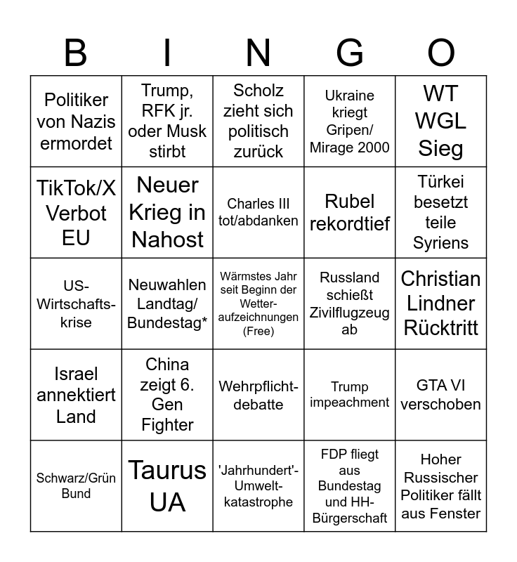 This bingo card has a free space and 24 words: China zeigt 6. Gen Fighter, Taurus UA, Charles III tot/abdanken, Schwarz/Grün Bund, WT WGL Sieg, Politiker von Nazis ermordet, TikTok/X Verbot EU, Trump, RFK jr. oder Musk stirbt, Russland schießt Zivilflugzeug ab, Wehrpflicht- debatte, Rubel rekordtief, US- Wirtschafts- krise, Trump impeachment, GTA VI verschoben, Neuer Krieg in Nahost, FDP fliegt aus Bundestag und HH-Bürgerschaft, Christian Lindner Rücktritt, Scholz zieht sich politisch zurück, Türkei besetzt teile Syriens, Neuwahlen Landtag/ Bundestag*, Hoher Russischer Politiker fällt aus Fenster, Israel annektiert Land, Ukraine kriegt Gripen/ Mirage 2000 and 'Jahrhundert'-Umwelt- katastrophe.