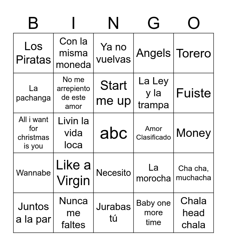 This bingo card has 41 words: El Bombón, All i want for christmas is you, De Musica Ligera, No me arrepiento de este amor, Nunca me faltes, Necesito, Start me up, Caraluna, Torero, Wannabe, Livin la vida loca, Angels, abc, Money, Amor Clasificado, Like a Virgin, Ojos así, Los Piratas, Tramposa y mentirosa, Ya no vuelvas, Cha cha, muchacha, Chala head chala, Jurabas tú, La Ley y la trampa, I will always love you, Unchained Melody (ghost), Baby one more time, Jailhouse rock, Fuiste, Gasolina, Muchachos, Con la misma moneda, Juntos a la par, Pa' la selección, La morocha, La pachanga, Ciega, sordomuda, Loco (tu forma de ser), Auto rojo, Demoliendo hoteles and Corazón partío.