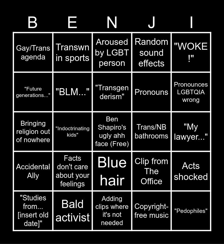 This bingo card has a free space and 24 words: Facts don't care about your feelings, Bald activist, "Transgen derism", "Studies from...[insert old date]", "WOKE !", Gay/Trans agenda, "Future generations...", Transwn in sports, Trans/NB bathrooms, Blue hair, Pronouns, Bringing religion out of nowhere, Clip from The Office, Acts shocked, "BLM...", Copyright-free music, "My lawyer...", Aroused by LGBT person, Pronounces LGBTQIA wrong, "Indoctrinating kids", "Pedophiles", Accidental Ally, Random sound effects and Adding clips where it's not needed.
