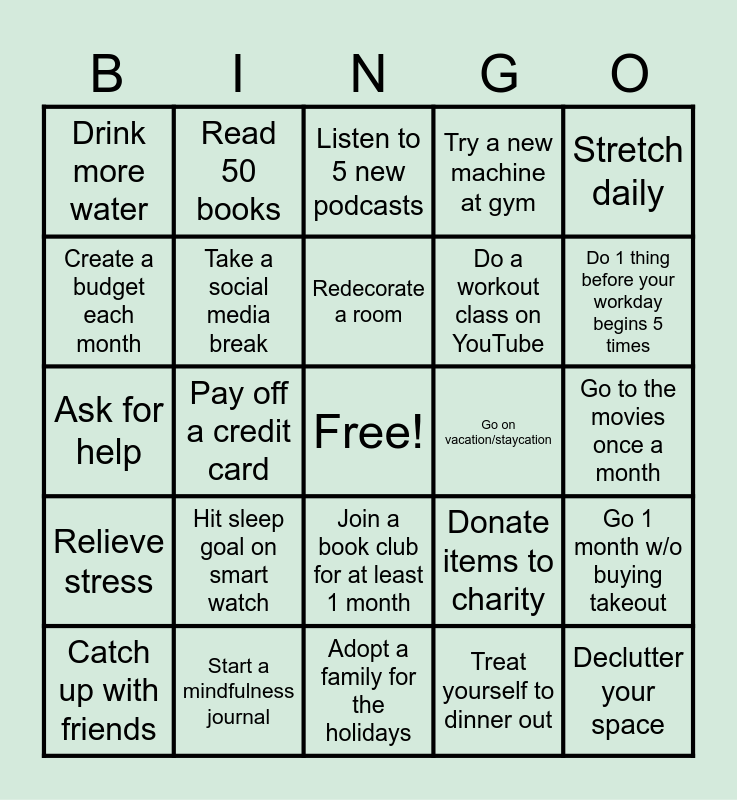 This bingo card has a free space and 64 words: Adopt/Foster a cat or dog, Go on 1 walk a week, Call grandparent(s) every other week, Go 1 month w/o buying takeout, Cook a new meal 7 times, Beat personal record on a favorite game, Read 50 books, Make 3 new friends, Redecorate a room, Take your mom to lunch 5 times, Join a book club for at least 1 month, Get back into a hobby, Go to the movies once a month, Stretch daily, Learn a new craft, Create a budget each month, Pay off a credit card, Drink more water, Hit fitness goal on smart watch, Do a workout class on YouTube, Hit sleep goal on smart watch, Relieve stress, Try a new machine at gym, Move at least once a day, Advocate for myself at work, Share a unique idea with supervisor, Lead a Team Huddle, Present in Team Huddle/Meeting, Learn a new skill, Hit personal goal at work, Read 10 self improvement books, Create a good workspace at home, Go to a networking event, Apply for a new position, Do 1 thing before your workday begins 5 times, Catch up with friends, Meditate every week, Treat yourself to dinner out, Do a self-care task, Take a social media break, Ask for help, Go on vacation/staycation, Compliment myself, Get 8 hours of sleep, Take a fresh air break once a week, Declutter your space, Start a mindfulness journal, Volunteer somewhere, Donate items to charity, Take 2 days off from social media per month, Mentor someone at your job, Facetime with a friend once a month, Adopt a family for the holidays, Learn more about cultures you’re unfamiliar with, Go to 3 concerts this year, Read 70 books this year, Listen to 5 new podcasts, Find a new YouTuber or channel, Ask friends for 1 recommendation per month, Watch a TV show outside your usual genre, Finally start that show that’s been on your Watch List, Listen to 1 album that you’ve never listened to, Watch 15 movies that aren’t your type and Watch 12 classic movies you’ve never seen.