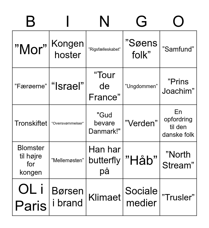 This bingo card has a free space and 54 words: Wildcard, Blomster til højre for kongen, Blomster til venstre for kongen, Han har slips på, Han har butterfly på, ”Sydslesvig”, ”Søens folk”, ”Grønland”, ”Færøerne”, ”Royal Run”, ”Mor”, ”Mary”, Børsen i brand, OL i Paris, ”Håndbold”, Klimaet, ”Trusler”, ”Ungdommen”, Snubler over ordene, En opfordring til den danske folk, ”Håb”, ”Europa”, ”Verden”, ”Samfund”, ”Krise”, Kongen hoster, Kongen rømmer sig, Sundhedsvæsenet, Beredskabet, Sociale medier, ”Trivsel”, ”Tankevækkende”, Kongen smiler skævt, ”Muligheder”, ”Rigsfælleskabet”, Kendt citat, Tronskiftet, ”North Stream”, ”Ligestilling”, “Israel”, “Rusland”, “Ukraine”, Rod med talekort, Ai/Kunstig intelligens, ”Mellemøsten”, “Frøkorpset”, Rygter, “Vingegaard”, “Tour de France”, ”Oversvømmelser”, ”Prins Joachim”, ”Mette Frederiksen”, M4/Cityringen and ”Putin”.