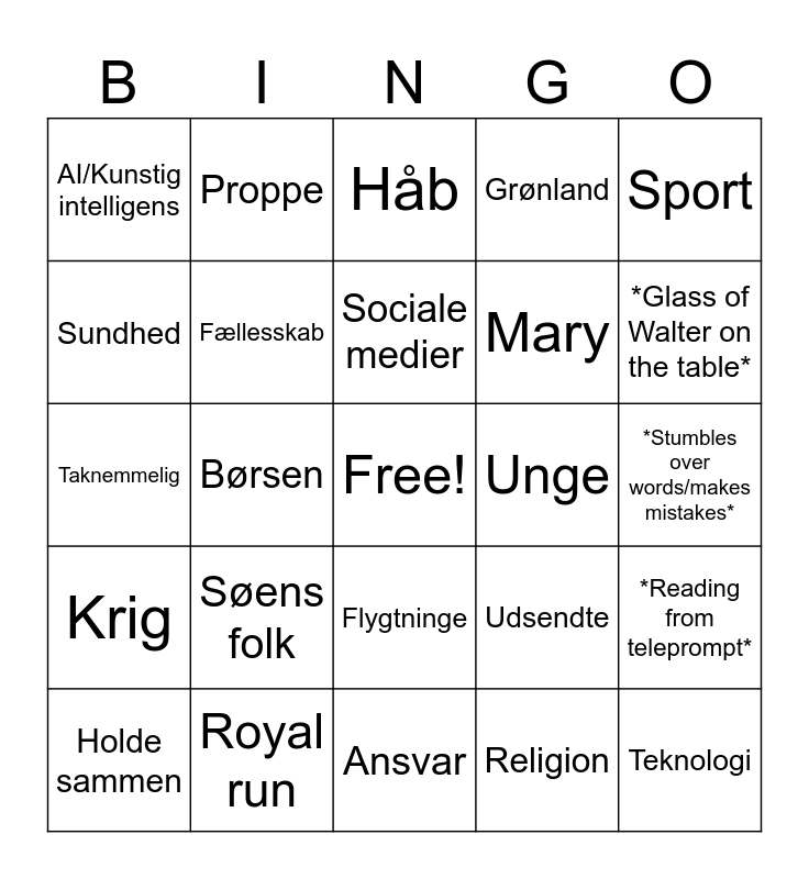 This bingo card has a free space and 58 words: MIn mor, Royal run, OL, Krig, Religion, Forpligtet, Fællesskab, Forbundne, Mary, Familie, Grønland, Færøerne, Gud bevare Danmark, Forandring, De ældre, AI/Kunstig intelligens, Teknologi, Sport, Uroligheder, Sociale medier, Unge, Håb, Holde sammen, *Reading from teleprompt*, *Coughs/clears throat*, *Stumbles over words/makes mistakes*, *Fumbles with readingcards*, *Greenlandic figures on the table*, *Glass of Walter on the table*, *Picture on the table*, *Is wearing glasses*, Børn, Tronskifte, Traditioner, Kronprins Christian, Opvækst, Fremtiden, Børsen, Taknemmelig, Ydmyg, Søens folk, Klima/miljø, Udsendte, Demokrati, Fred, Krise, Fremtidige generationer, Flygtninge, Ansvar, Præsidentvalg, Rigsfællesskabet, Moderne, Sydslesvig, 52 år, Proppe, Morfar, Sundhed and EU.
