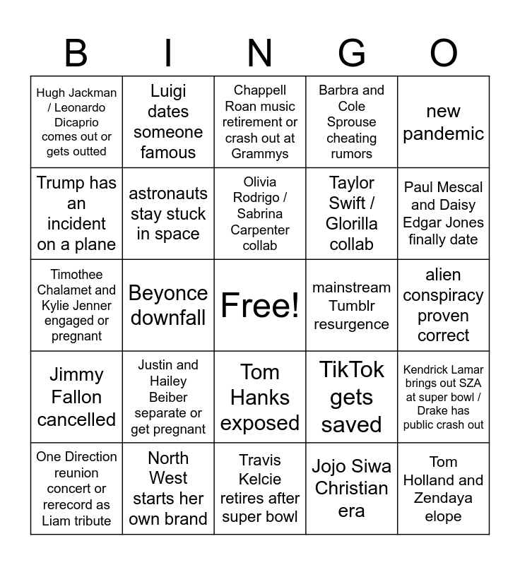 This bingo card has a free space and 25 words: Justin and Hailey Beiber separate or get pregnant, Travis Kelcie retires after super bowl, Olivia Rodrigo / Sabrina Carpenter collab, One Direction reunion concert or rerecord as Liam tribute, new pandemic, Hugh Jackman / Leonardo Dicaprio comes out or gets outted, Trump has an incident on a plane, Luigi dates someone famous, mainstream Tumblr resurgence, Tom Hanks exposed, Taylor Swift / Glorilla collab, Timothee Chalamet and Kylie Jenner engaged or pregnant, TikTok gets saved, Kendrick Lamar brings out SZA at super bowl / Drake has public crash out, astronauts stay stuck in space, Trisha Paytas on Survivor, Masked Singer, or DWTS, alien conspiracy proven correct, Chappell Roan music retirement or crash out at Grammys, Paul Mescal and Daisy Edgar Jones finally date, Beyonce downfall, Tom Holland and Zendaya elope, North West starts her own brand, Jimmy Fallon cancelled, Barbra and Cole Sprouse cheating rumors and Jojo Siwa Christian era.