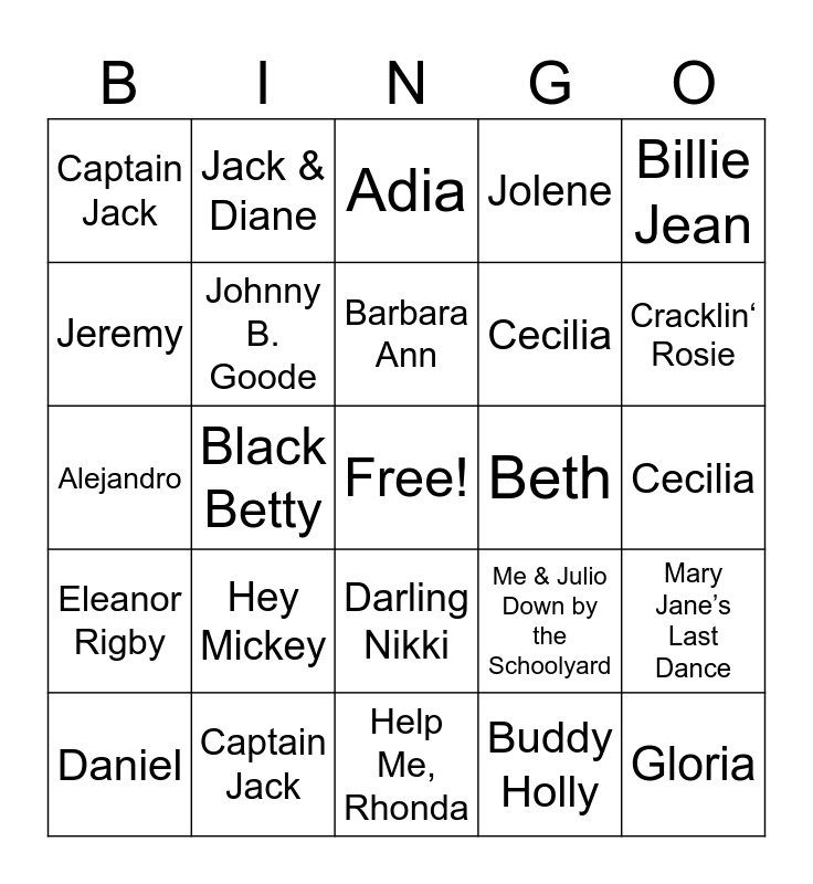 This bingo card has a free space and 46 words: Fernando, Gloria, Goodbye Earl, Help Me, Rhonda, Hey Mickey, Iris, Jack & Diane, Janie’s Got a Gun, Jeremy, Jessie’s Girl, Johnny B. Goode, Jolene, Mary Jane’s Last Dance, Me & Julio Down by the Schoolyard, My Sharona, Bad, Bad Leroy Brown, Barbara Ann, Beth, Bette Davis Eyes, Billie Jean, Black Betty, Buddy Holly, Captain Jack, Cecilia, Come on Eileen, Cracklin‘ Rosie, Daniel, Danny’s Song, Darling Nikki, Eleanor Rigby, Elvira, Rhiannon, Runaround Sue, Stacy’s Mom, Valleri, Captain Jack, Cecilia, Come on Eileen, Cracklin‘ Rosie, 867-5309/Jenny, A Boy Named Sue, Adia, Alejandro, Amanda, Angie and Annie’s Song.