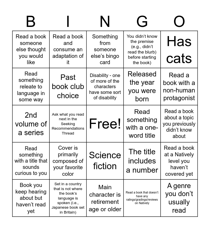 This bingo card has a free space and 24 words: Book you keep hearing about but haven’t read yet, Cover is primarily composed of your favorite color, Disability - one of more of the characters have some sort of disability, Read a book that doesn’t have any ratings/gradings/reviews on Natively, Has cats, Read a book someone else thought you would like, Read a book and consume an adaptation of it, Something from someone else’s bingo card, Read something with a one-word title, Read a book about a topic you previously didn’t know about, 2nd volume of a series, Past book club choice, The title includes a number, Read a book at a Natively level you haven’t covered yet, Read something releate to language in some way, Set in a country that is not where the book’s language is spoken (i.e., Japanese book set in Britain), Main character is retirement age or older, You didn’t know the premise (e.g., didn’t read the blurb) before starting the book), Read a book with a non-human protagonist, Read something with a title that sounds curious to you, Ask what you read next in the Seeking Recommendations Thread, Science fiction, Released the year you were born and A genre you don’t usually read.