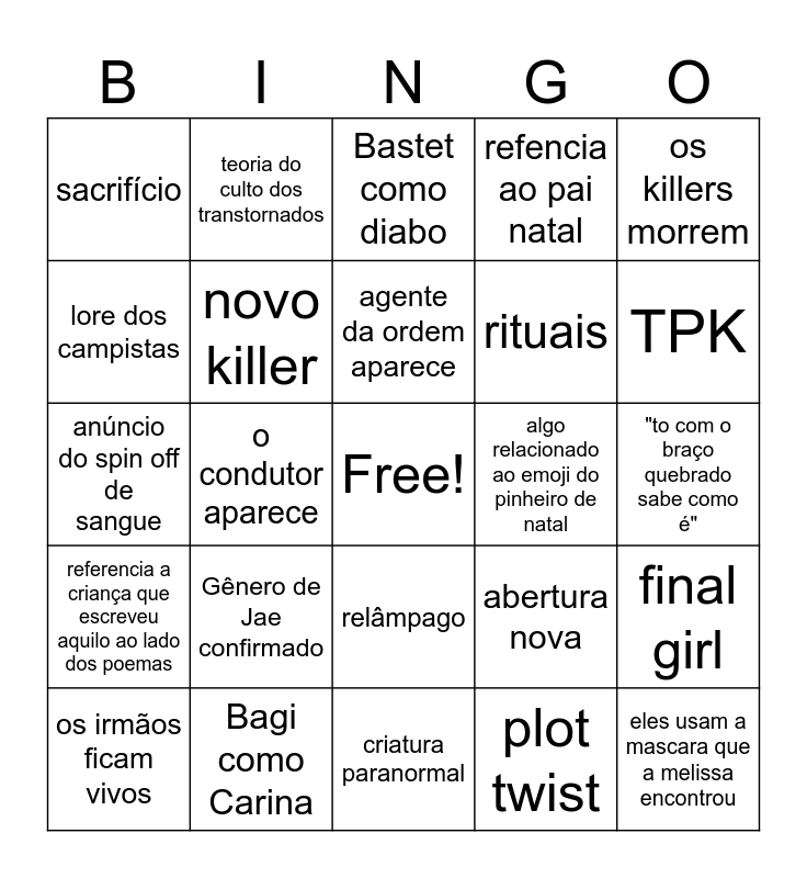 This bingo card has a free space and 24 words: Gênero de Jae confirmado, Bagi como Carina, agente da ordem aparece, os irmãos ficam vivos, os killers morrem, sacrifício, lore dos campistas, teoria do culto dos transtornados, algo relacionado ao emoji do pinheiro de natal, relâmpago, rituais, anúncio do spin off de sangue, abertura nova, final girl, novo killer, plot twist, "to com o braço quebrado sabe como é", Bastet como diabo, TPK, o condutor aparece, eles usam a mascara que a melissa encontrou, referencia a criança que escreveu aquilo ao lado dos poemas, refencia ao pai natal and criatura paranormal.