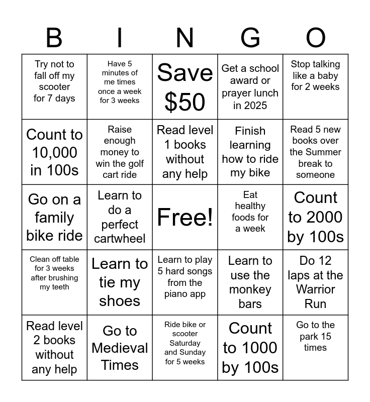 This bingo card has a free space and 24 words: Learn to tie my shoes, Go to Medieval Times, Read level 1 books without any help, Read level 2 books without any help, Stop talking like a baby for 2 weeks, Try not to fall off my scooter for 7 days, Count to 10,000 in 100s, Have 5 minutes of me times once a week for 3 weeks, Eat healthy foods for a week, Learn to play 5 hard songs from the piano app, Finish learning how to ride my bike, Go on a family bike ride, Learn to use the monkey bars, Do 12 laps at the Warrior Run, Raise enough money to win the golf cart ride, Count to 1000 by 100s, Count to 2000 by 100s, Save $50, Read 5 new books over the Summer break to someone, Learn to do a perfect cartwheel, Go to the park 15 times, Clean off table for 3 weeks after brushing my teeth, Get a school award or prayer lunch in 2025 and Ride bike or scooter Saturday and Sunday for 5 weeks.