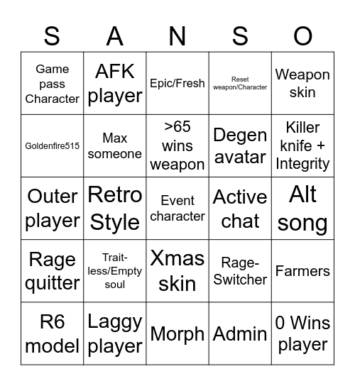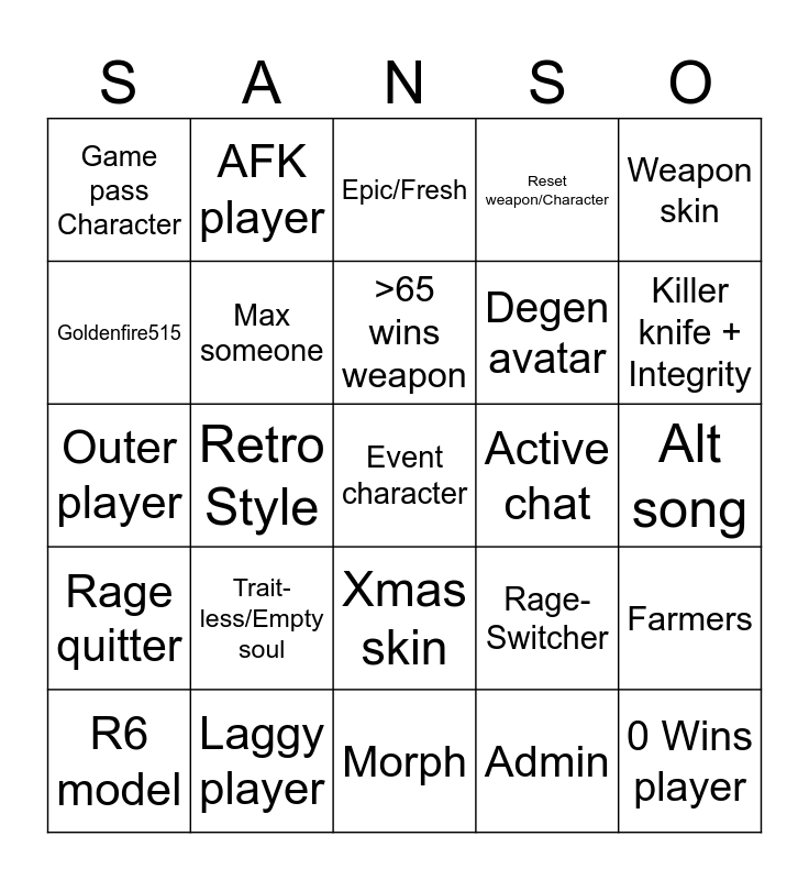 This bingo card has a free space and 25 words: Trait-less/Empty soul, Morph, >65 wins weapon, R6 model, Weapon skin, Game pass Character, Goldenfire515, AFK player, Active chat, Xmas skin, Degen avatar, Outer player, Rage- Switcher, Farmers, Max someone, 10k XP on 5 sans', Alt song, Epic/Fresh, Killer knife + Integrity, Retro Style, 0 Wins player, Laggy player, Rage quitter, Reset weapon/Character and Admin.