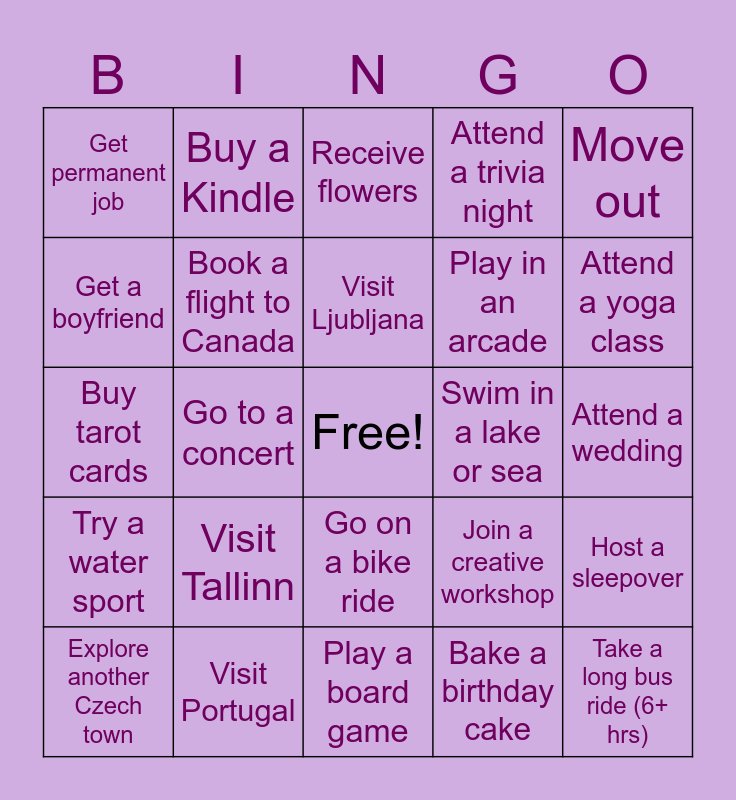 This bingo card has a free space and 24 words: Visit Tallinn, Visit Portugal, Visit Ljubljana, Explore another Czech town, Move out, Get permanent job, Get a boyfriend, Buy a Kindle, Swim in a lake or sea, Go on a bike ride, Play in an arcade, Buy tarot cards, Join a creative workshop, Host a sleepover, Book a flight to Canada, Bake a birthday cake, Attend a wedding, Receive flowers, Attend a yoga class, Go to a concert, Take a long bus ride (6+ hrs), Try a water sport, Attend a trivia night and Play a board game.