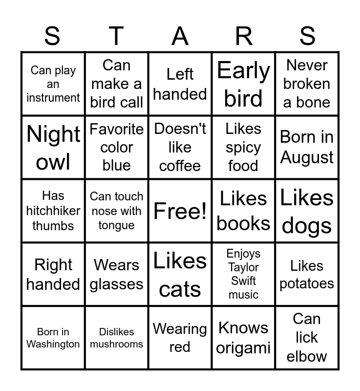 This bingo card has a free space and 29 words: Born in Washington, Enjoys country music, Can touch nose with tongue, Can speak 2+ languages, Can play an instrument, Left handed, Favorite color blue, Wears glasses, Likes books, Dislikes mushrooms, Likes dogs, Can lick elbow, Wearing red, Knows origami, Born in August, Likes crafts, Likes cats, Right handed, Never broken a bone, Has hitchhiker thumbs, Enjoys Taylor Swift music, Favorite color green, Likes spicy food, Night owl, Early bird, Can make a bird call, Likes potatoes, Doesn't like coffee and Can snap fingers.