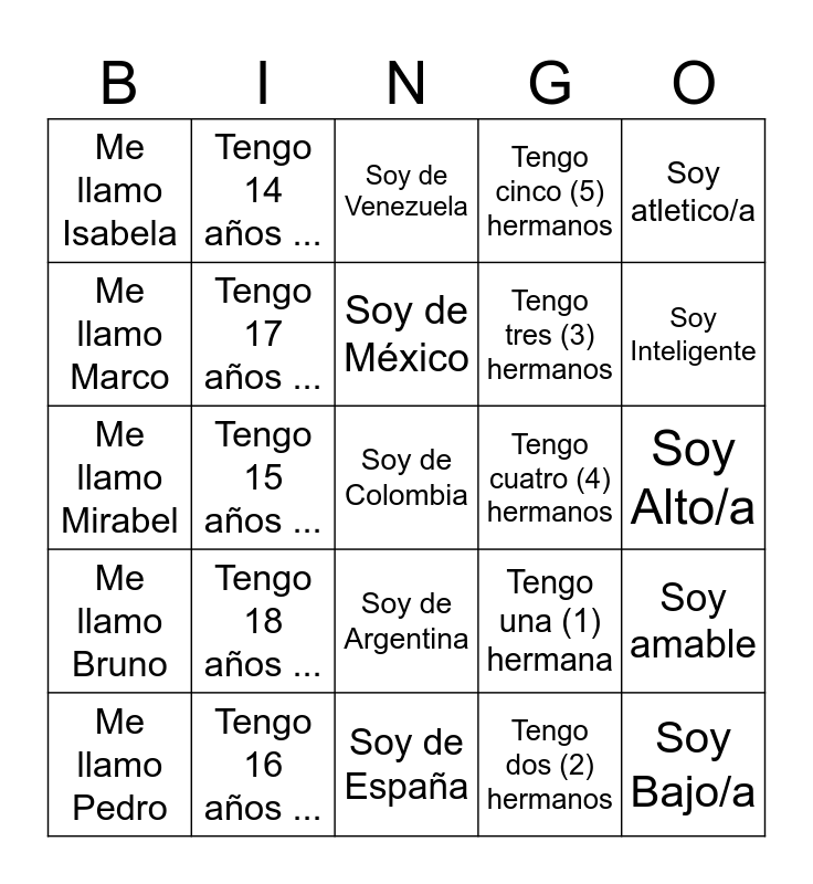 This bingo card has 25 words: Me llamo Bruno, Tengo 16 años ..., Soy de Colombia, Tengo dos (2) hermanos, Soy atletico/a, Me llamo Isabela, Tengo 14 años ..., Soy de Venezuela, Tengo cuatro (4) hermanos, Soy amable, Me llamo Marco, Tengo 17 años ..., Soy de España, Tengo una (1) hermana, Soy Inteligente, Me llamo Pedro, Tengo 15 años ..., Soy de México, Tengo tres (3) hermanos, Soy Alto/a, Me llamo Mirabel, Tengo 18 años ..., Soy de Argentina, Tengo cinco (5) hermanos and Soy Bajo/a.