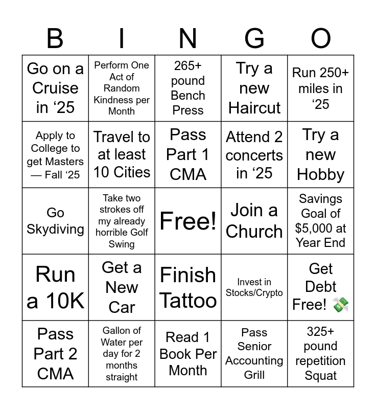 This bingo card has a free space and 24 words: Get a New Car, Gallon of Water per day for 2 months straight, Pass Part 1 CMA, Pass Part 2 CMA, Run 250+ miles in ‘25, Go on a Cruise in ‘25, Apply to College to get Masters — Fall ‘25, Perform One Act of Random Kindness per Month, Join a Church, Finish Tattoo, Attend 2 concerts in ‘25, Go Skydiving, Invest in Stocks/Crypto, Get Debt Free! 💸, Travel to at least 10 Cities, Pass Senior Accounting Grill, Savings Goal of $5,000 at Year End, 265+ pound Bench Press, Try a new Hobby, Take two strokes off my already horrible Golf Swing, 325+ pound repetition Squat, Run a 10K, Try a new Haircut and Read 1 Book Per Month.